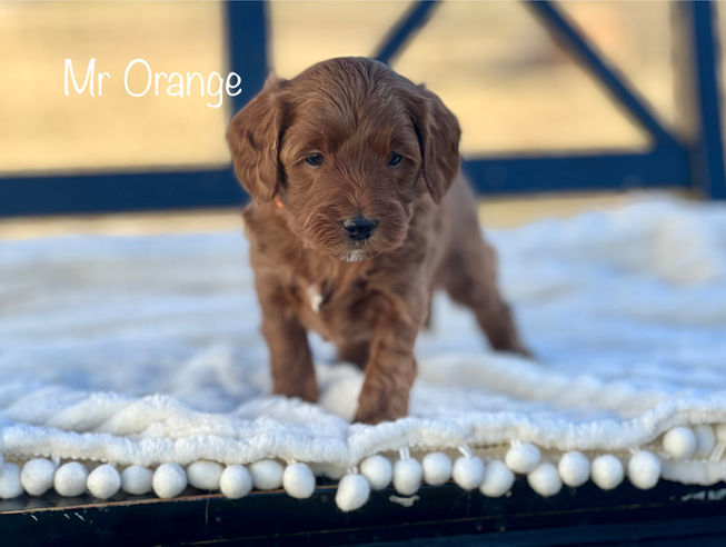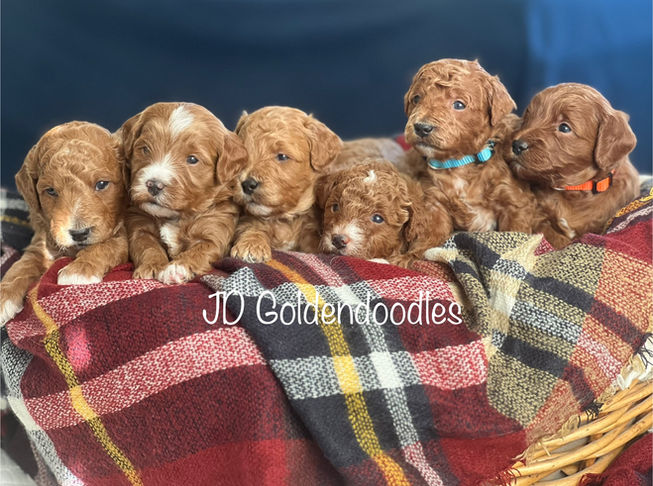 Retirement Litter of abstract F1 mini red/cream Goldendoodle puppies. These puppies will be 25-40lbs with abstract markings, and soft and wavy coat. They are hypoallergenic, intelligent and very snuggly.